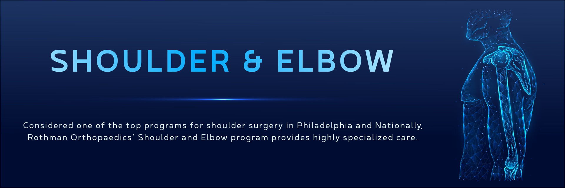 Considered one of the top programs for shoulder surgery in Philadelphia and nationally, Rothman Orthopaedic Institute's Shoulder and Elbow program provides highly specialized care to those experiencing arm pain in Philadelphia. Patients of the program benefit from the expertise of specialists who perform more than 3,000 procedures each year and pioneer advances in shoulder repair and replacement.