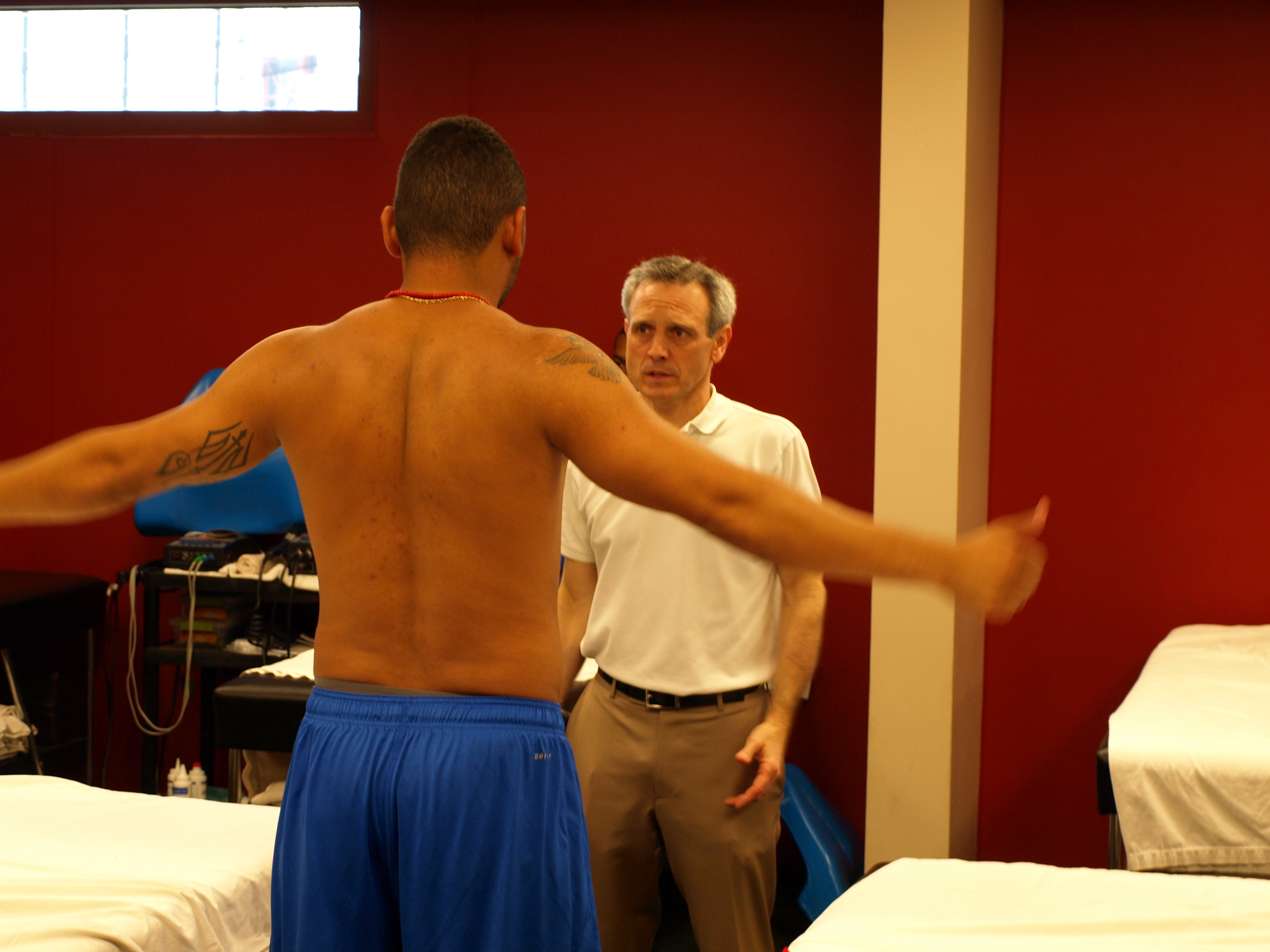 The exam is tailored to the affected area. The first player has some hip and knee issues. Dr. Ciccotti runs him through a variety of movements flexing, stretching, twisting… then confers with the assembled trainers.