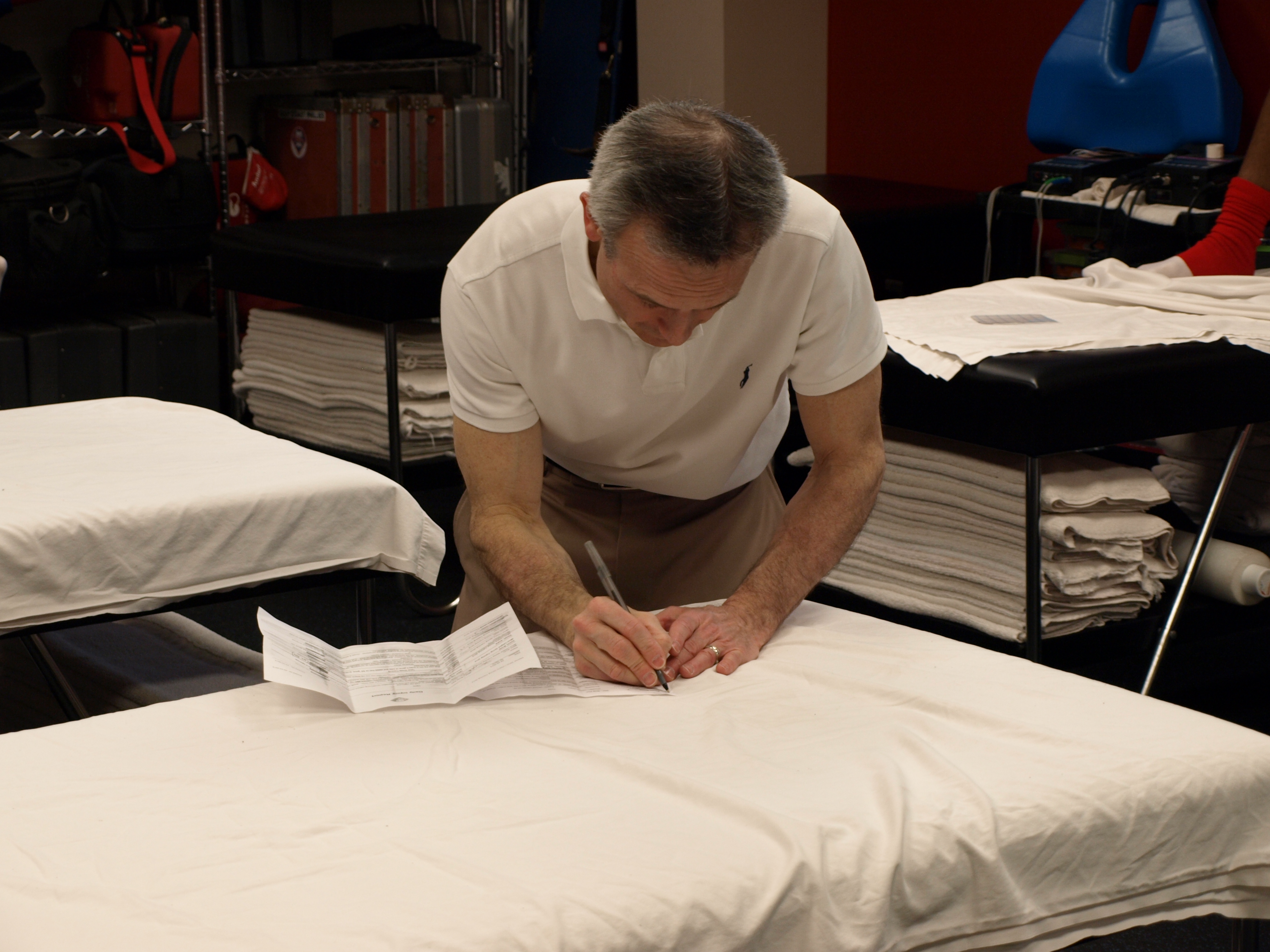 The players keep coming… with their scars and their tattoos. Each one telling Dr. Ciccotti his issues and going through the exam as the training staff looks on, taking mental notes.