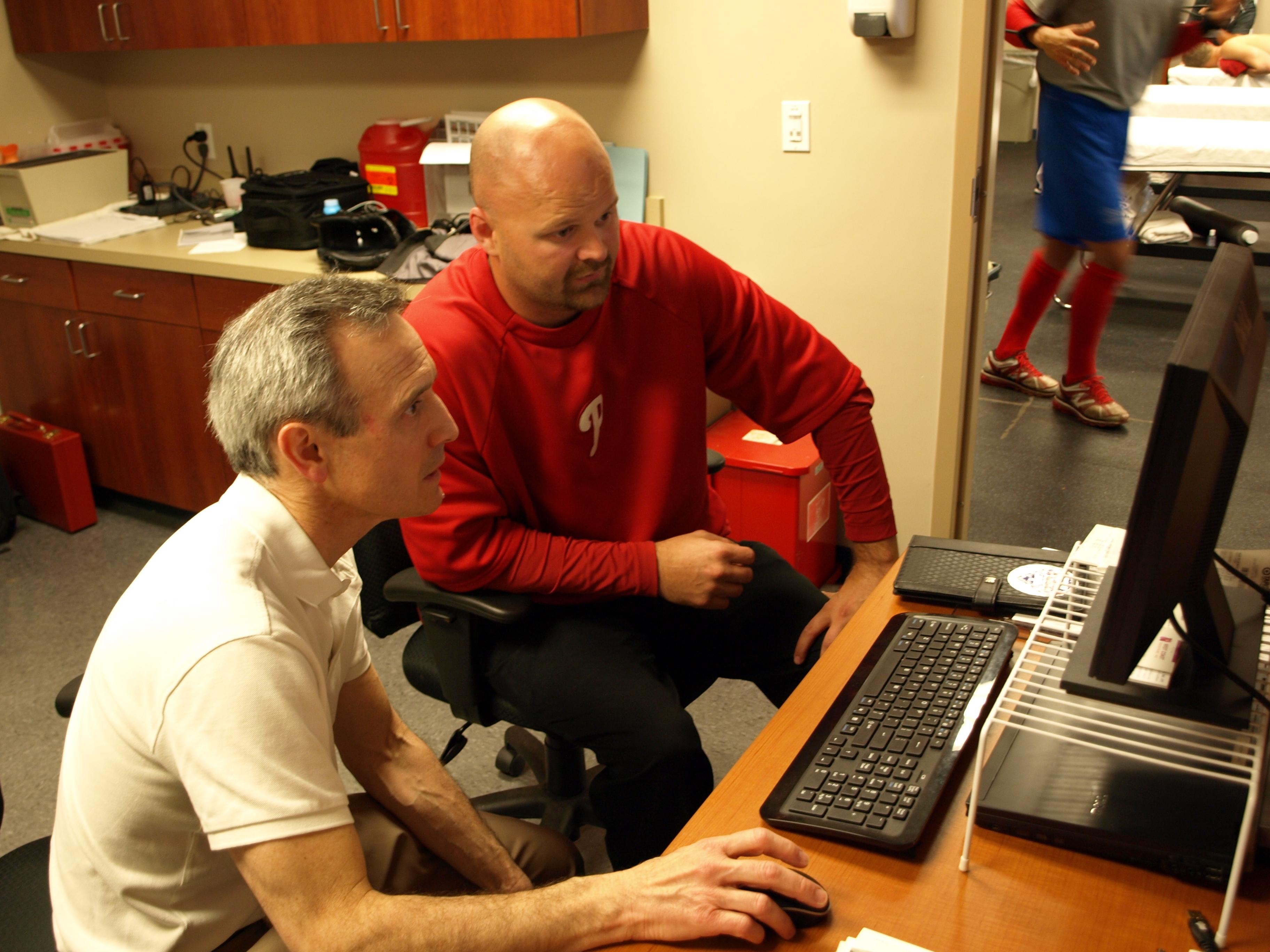 “What your average Phillies fan sees on the field at Citizens Bank Park is just the tip of the iceberg. The overwhelming bulk of the organization lies beneath the surface in the minor leagues,” says Dr. Ciccotti who has since retreated into a medical team office to review some images with James Ready, Head Minor League Training Coordinator for the Phillies.